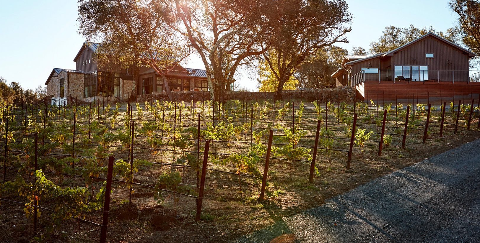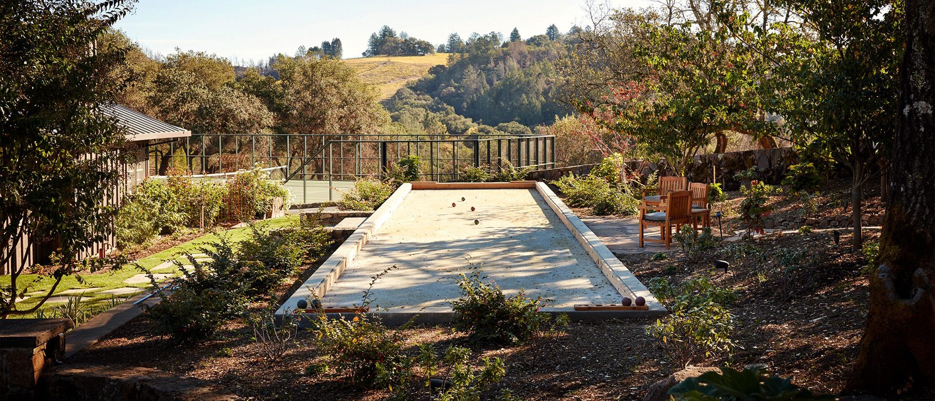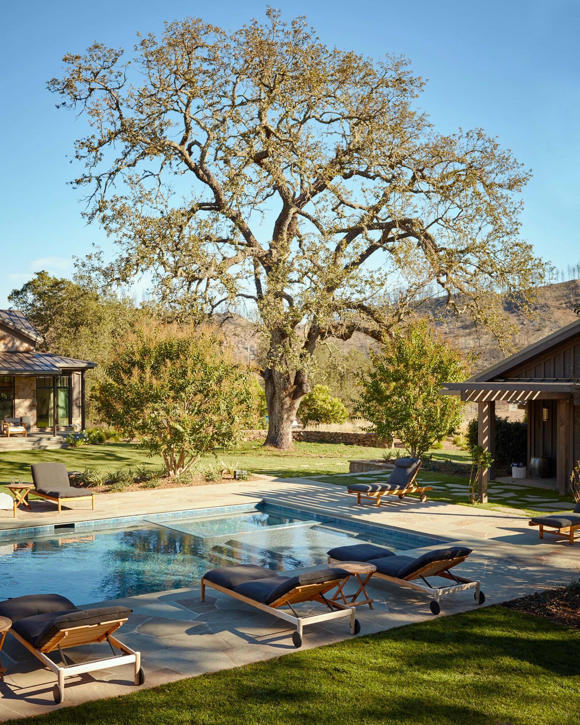 Dovetailed into the oak woodland hills of Calistoga, a rocking chair and niche planters on the veranda, a guest house hosted by a friendly and well-stitched outdoor program, uninterrupted. Ribbons of site stone frame and lead to the welcome mat. Generous eats, laps, pitches and grape juice, kindness and warmth finding the seamless indoor outdoor.