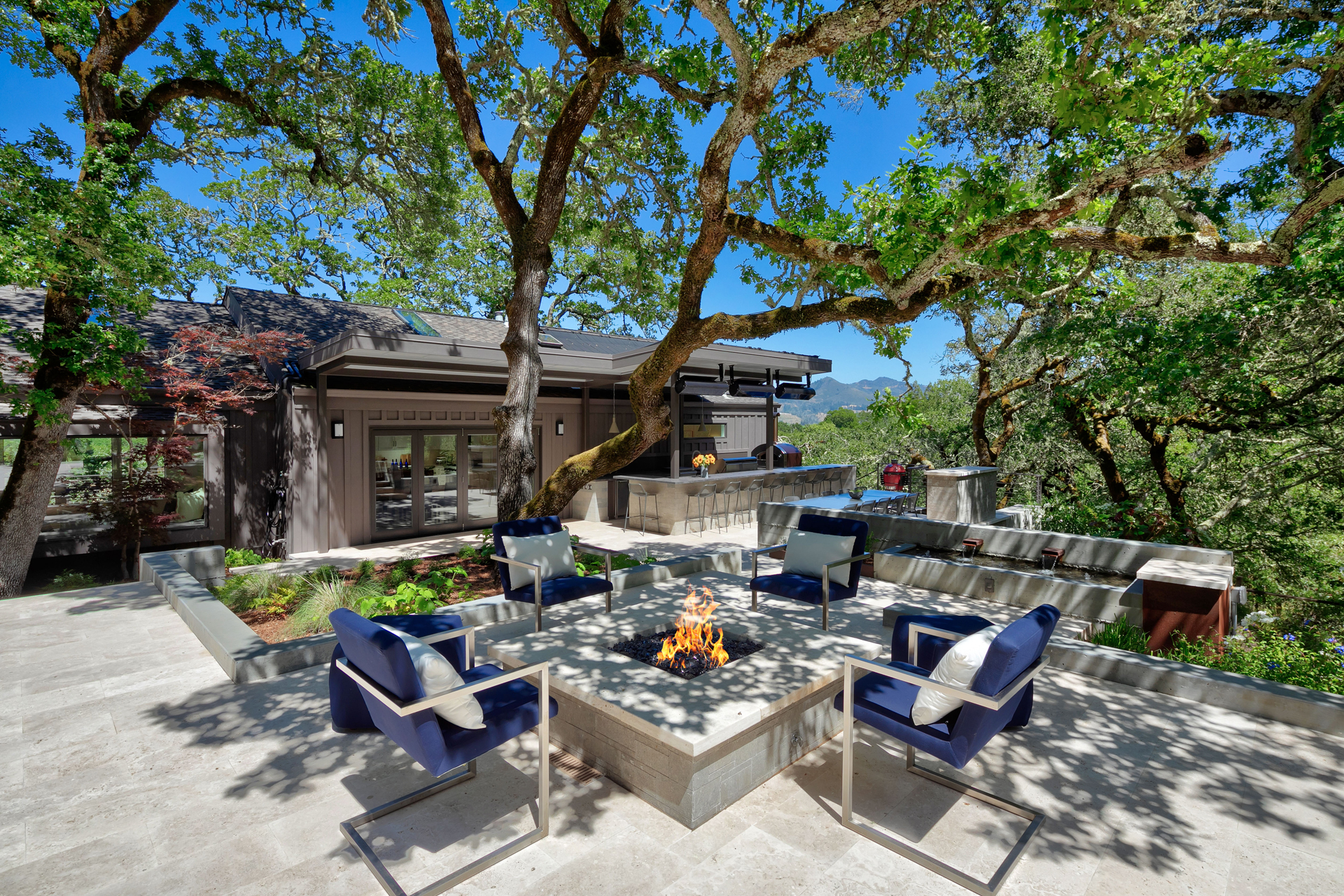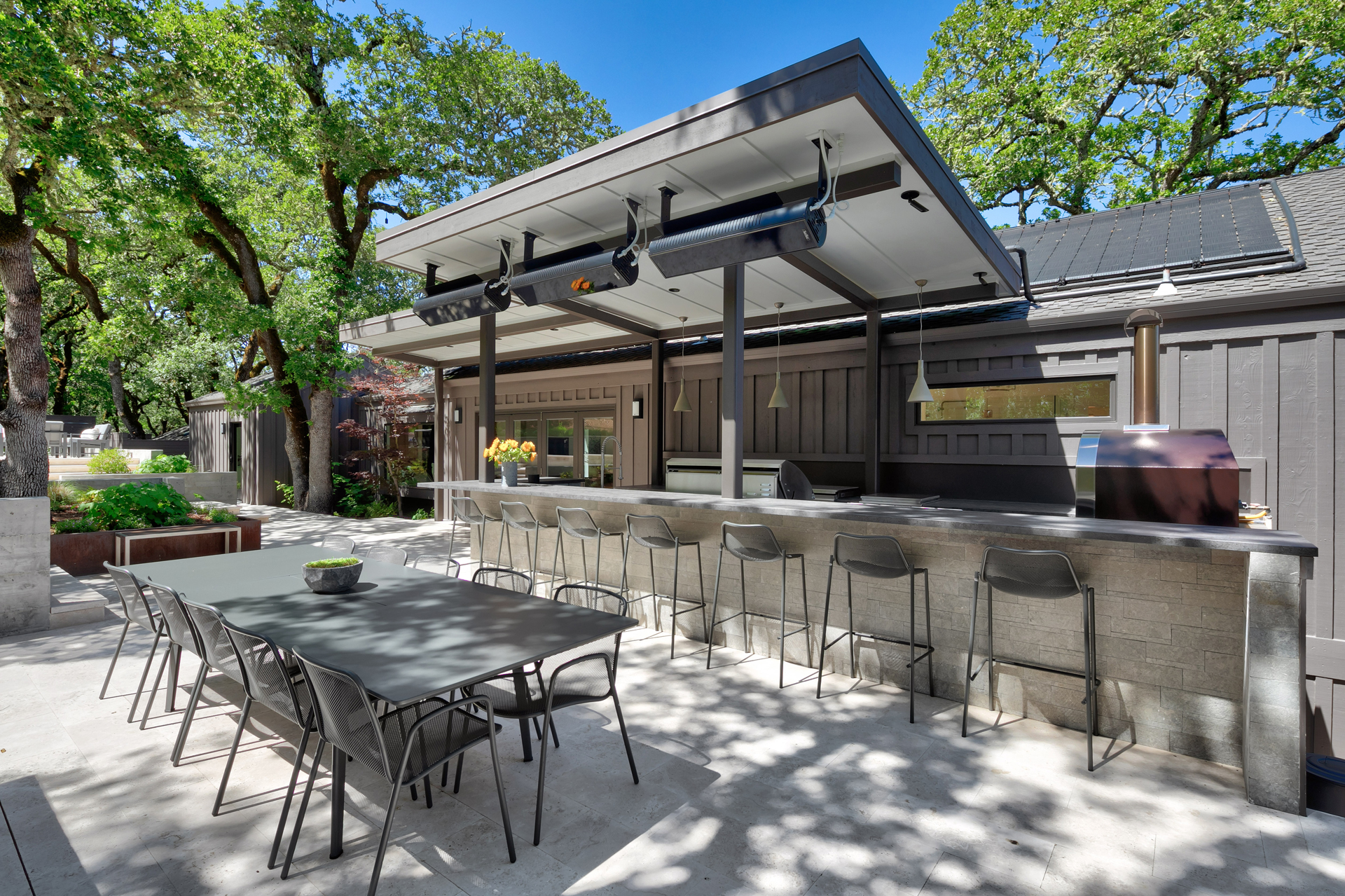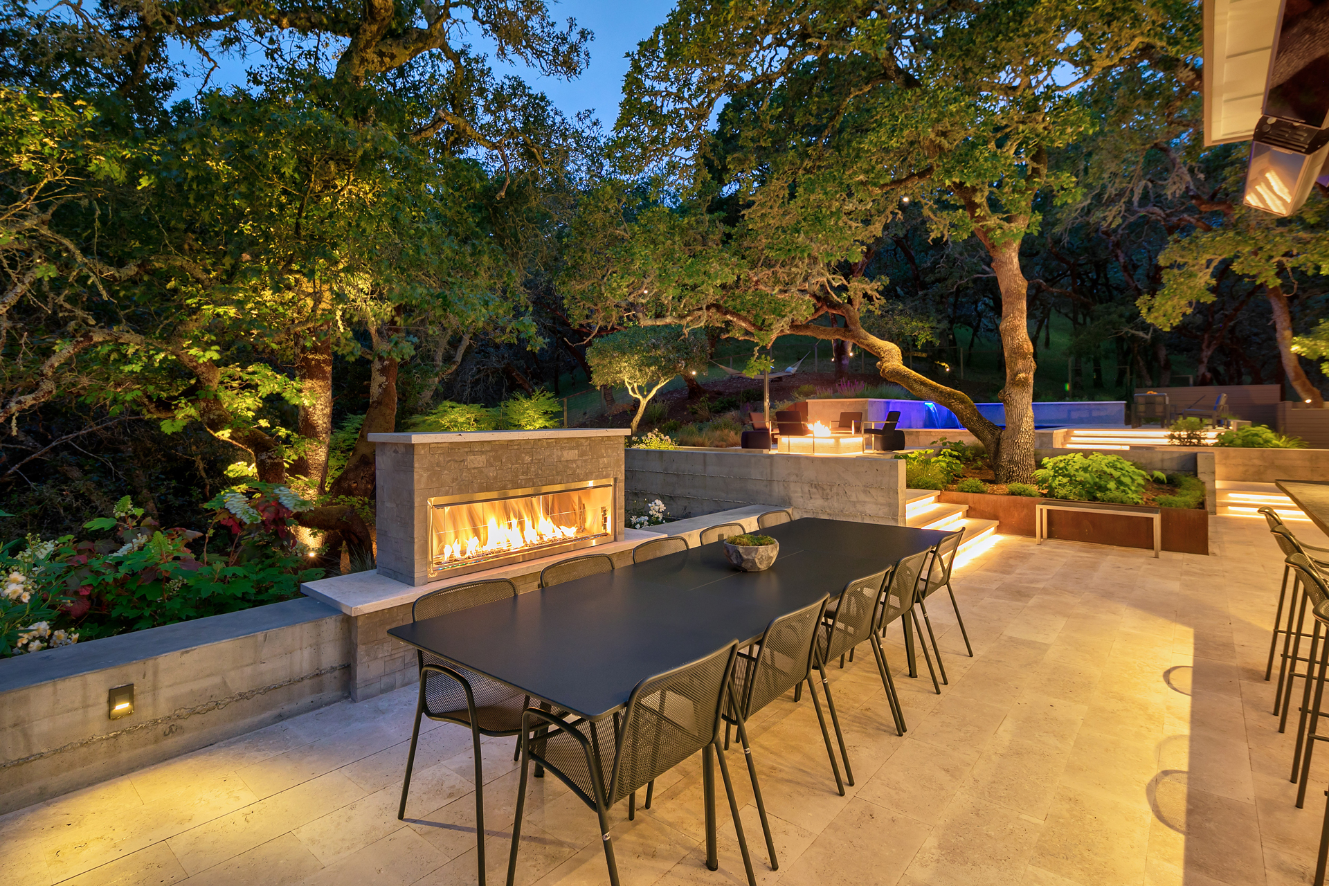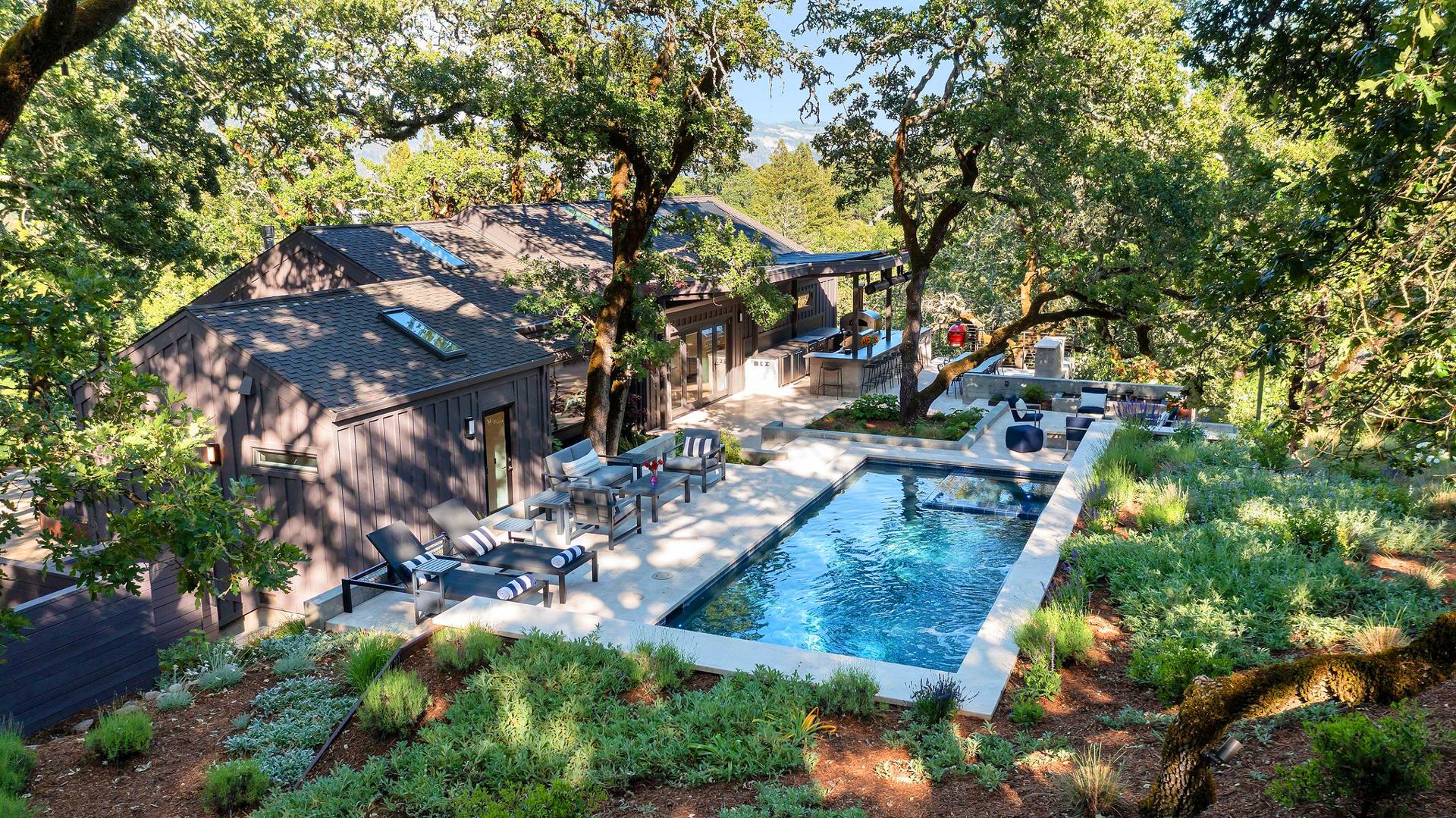 Designed to hold a long view, short terraced moments react. The promise of ease to chill, eager with purpose. In a lush green surround, the connections for the indoor-outdoor speak to a simple place of leisure. A refreshing plunge entertains, the recreation of a soak and plunge for something served up, satisfying and scrumptious, tasty and humble.